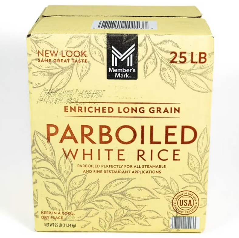 Description: A massive 25lb industrial-sized bag of long-grain parboiled rice.