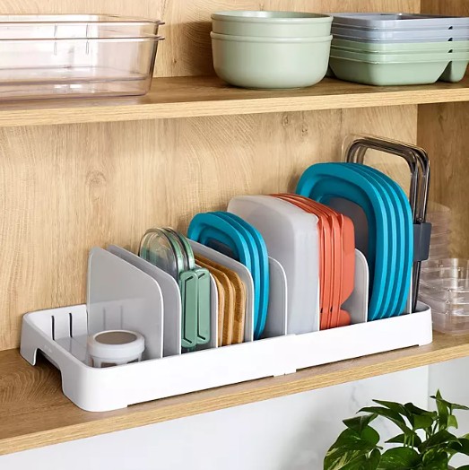 Say goodbye to the chaotic lid drawer. This expandable organizer adjusts to fit cabinet sizes and stacks lids neatly.