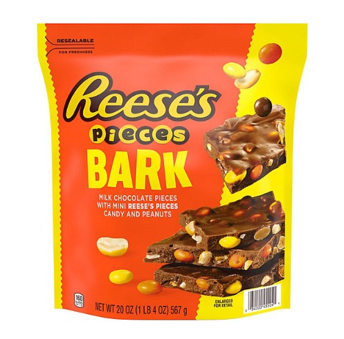 A thick slab of white and milk chocolate topped with crunchy Reese’s Pieces.
