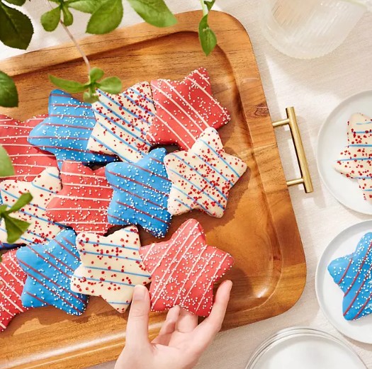 Frosted sugar cookies shaped like stars and decorated in patriotic colors. Soft, sweet, and festive.
