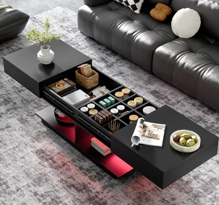 - Table with storage drawers and LED lights.