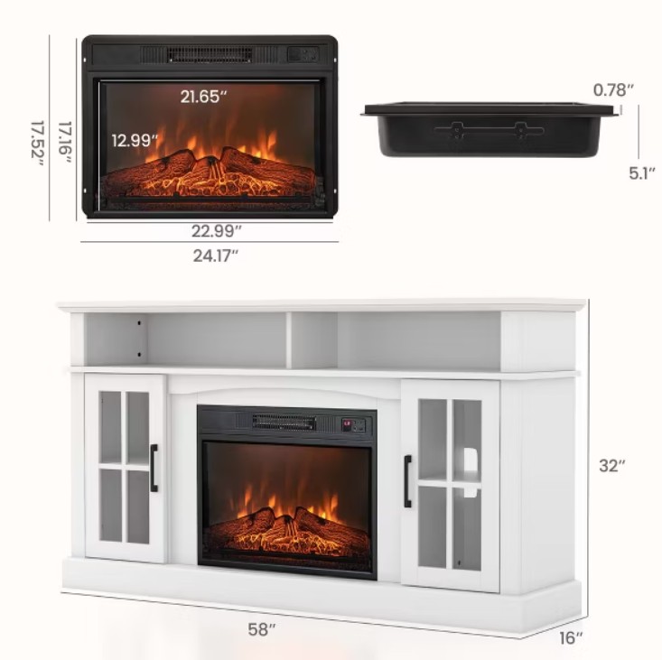 - TV stand with electric fireplace for up to 65-inch TVs.
