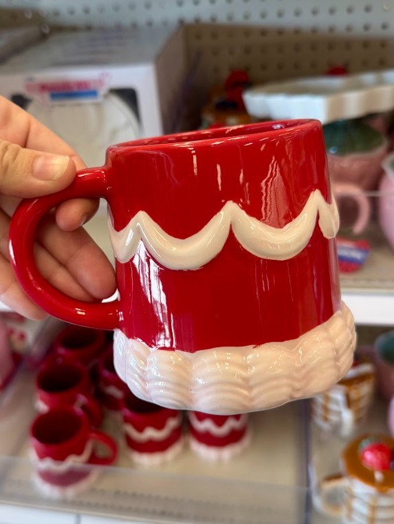 This cheerful Santa-suit mug adds holiday charm long after Christmas. With a glossy red finish and sculpted white trim, it’s cozy, playful, and perfect for cocoa, coffee, or gifting.