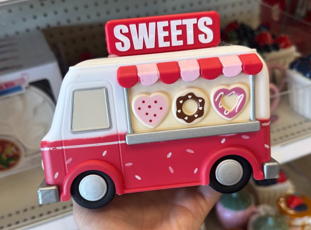 This adorable sweets truck décor piece looks like a Valentine’s food truck and makes a standout shelf accent.