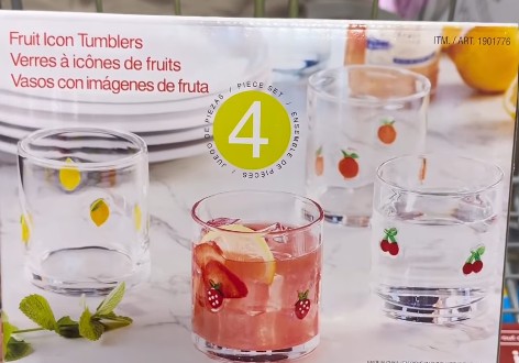 A set of four hand-blown stemless glasses featuring colorful 3D fruit designs that social media users claim look identical to high-end boutique versions.