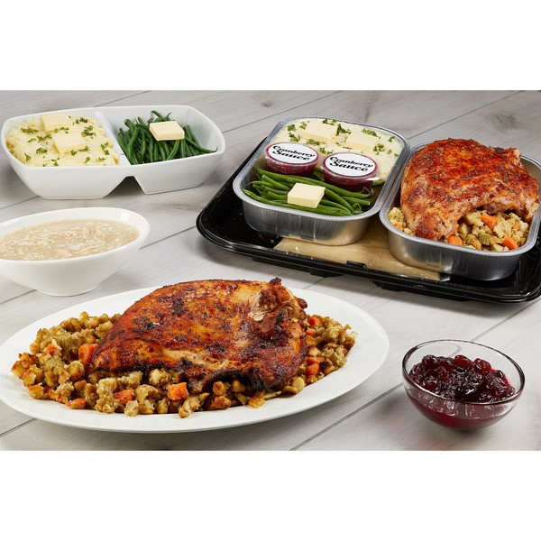 - Complete meal kit feeds 7–8: turkey, mashed potatoes, gravy, stuffing, green beans, and cranberry sauce—stress-free holiday centerpiece.