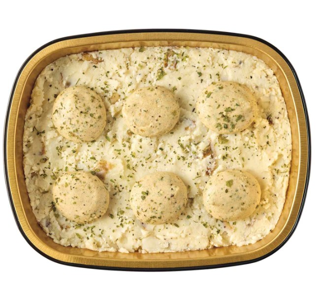 Mashed Potatoes & Gravy Butter: Yukon Gold potatoes that are pre-mashed with butter. The texture is smooth, not gummy, and they heat up evenly in the provided tray.