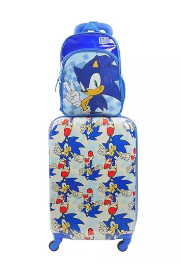Let kids travel in style with this matching suitcase and backpack duo featuring bold prints and wheeled convenience.