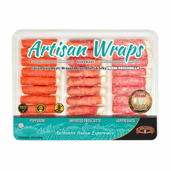 These artisan wraps feature Italian-style meats like prosciutto and salami wrapped around fresh mozzarella, offering a savory, protein-rich snack.