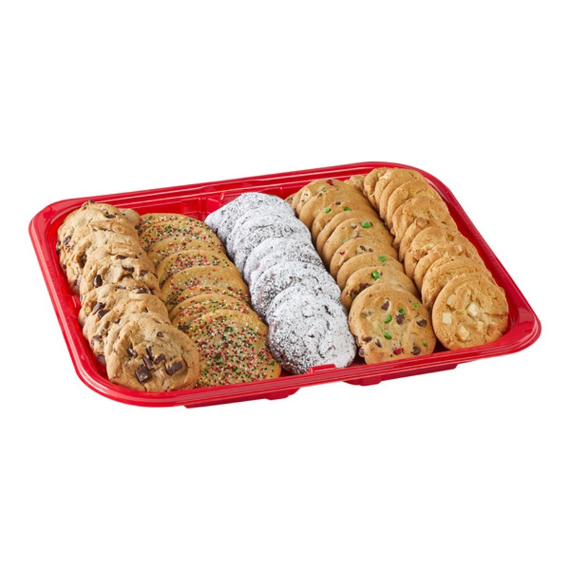 This cookie tray is filled with an assortment of festive cookies, perfect for holiday gatherings. It includes a variety of flavors, from classic sugar cookies to decadent chocolate ones. The tray offers a quick, no-hassle way to serve treats during parties or family dinners. It’s great for people who want to offer an assortment without the effort of baking multiple recipes. The variety ensures that there is something for everyone to enjoy during the holiday season.