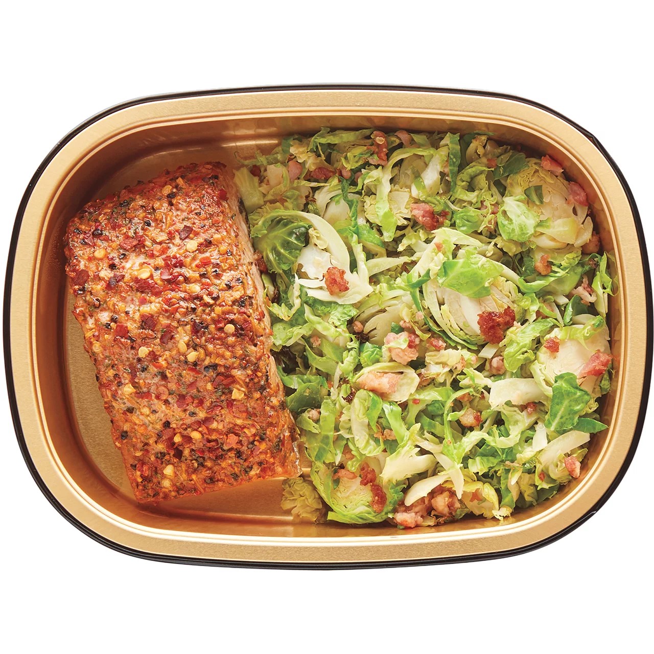 - H-E-B’s Meal Simple line shines with this Atlantic salmon filet seasoned steakhouse-style, paired with garlicky shaved Brussels sprouts and bacon. It’s a creative, protein-packed option that fuels you up without feeling heavy, all ready in minutes.