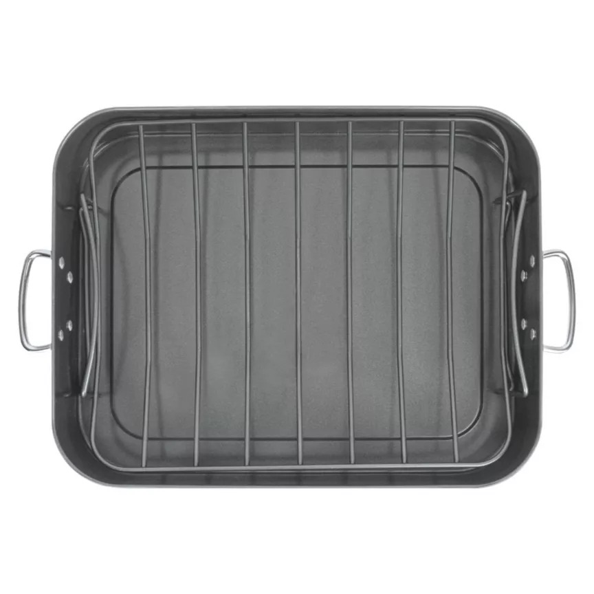 - Heavy-duty metal pan with rack for juicy meats and crispy veggies; deep sides and 450°F oven-safe for splatter-free roasting.
