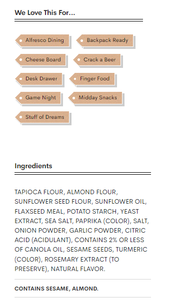 We love these crackers for their crunchy texture and rich, cheesy flavor, making them a perfect accompaniment to dips, cheeses, or on their own. Their wholesome ingredients and gluten-free label make them a fantastic choice for health-conscious snackers.