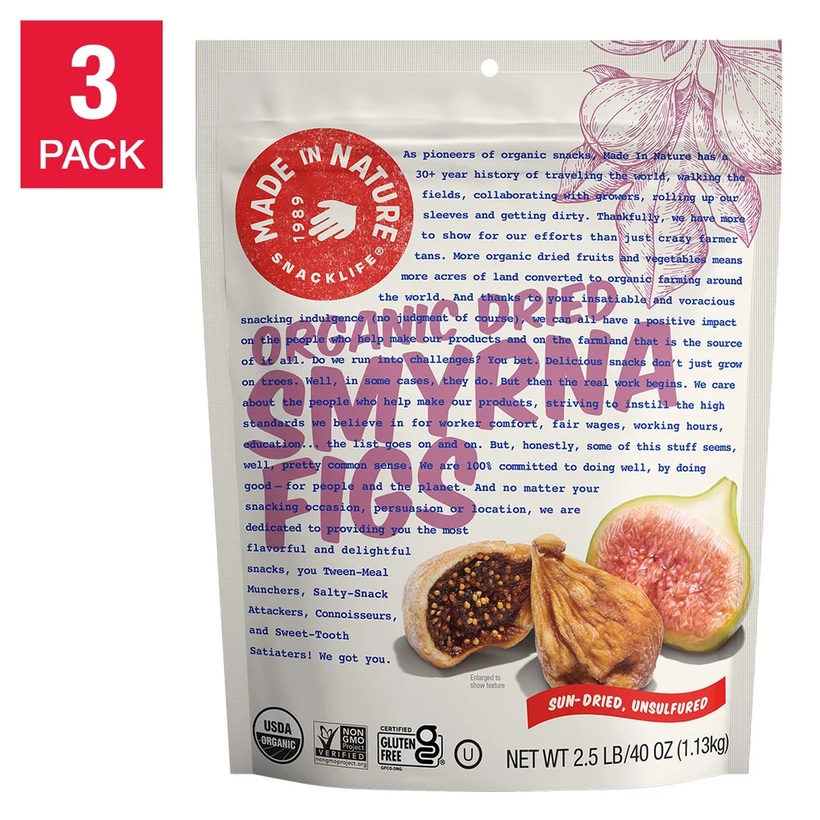 Made In Nature Organic Calimyrna Figs are sweet, plump, and packed with natural flavor. These figs are grown without synthetic fertilizers or pesticides, ensuring they are as pure as they are delicious. Their chewy texture and rich sweetness make them perfect for snacking, adding to baked goods, or enjoying with cheese. Figs are also known for their health benefits, including being a great source of fiber and antioxidants. Shoppers love the quality and taste of these figs, which are perfect for both everyday use and special occasions.