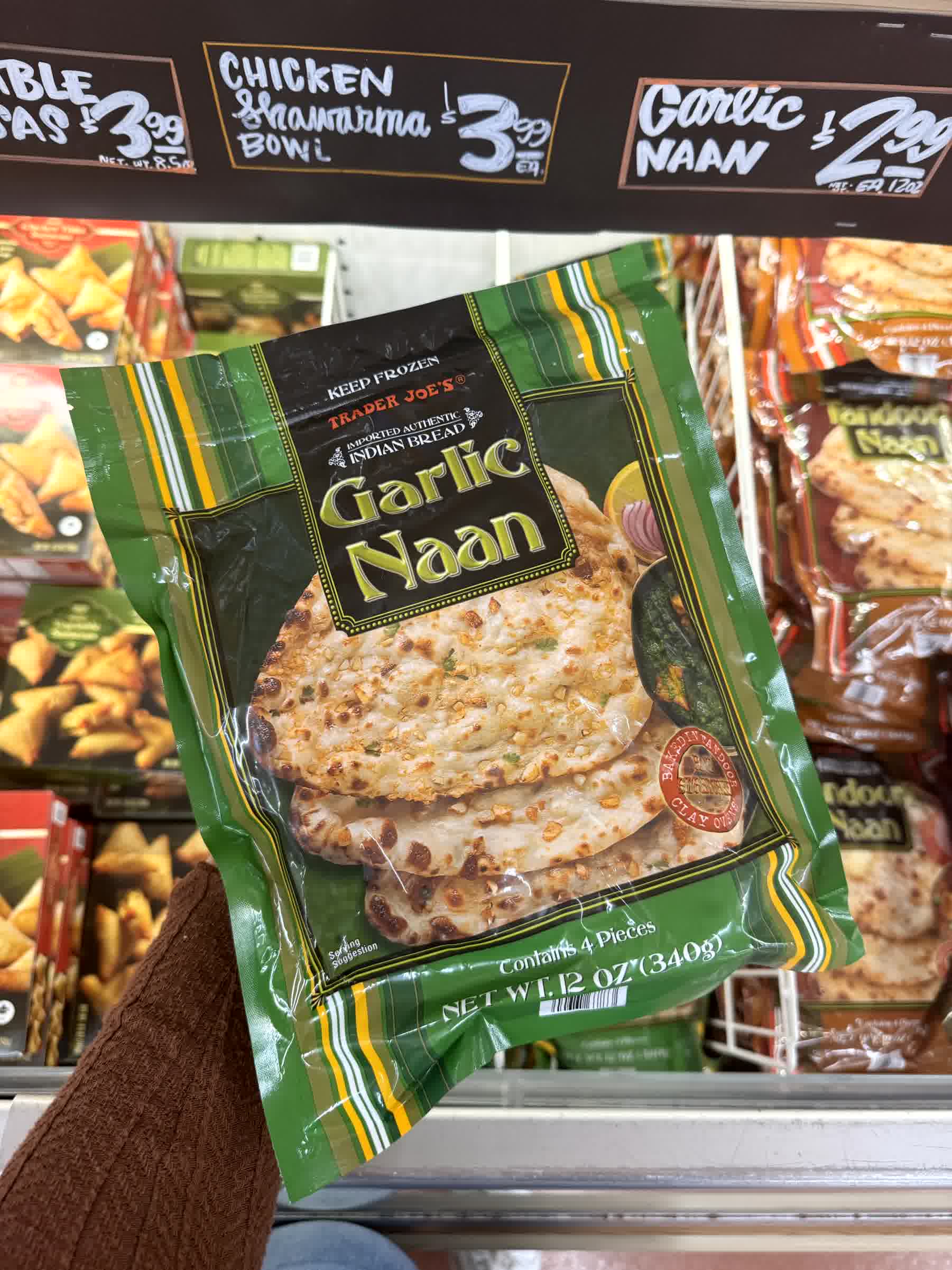Soft and fluffy Indian-style flatbread topped with roasted garlic and herbs, found in Trader Joe’s freezer section.