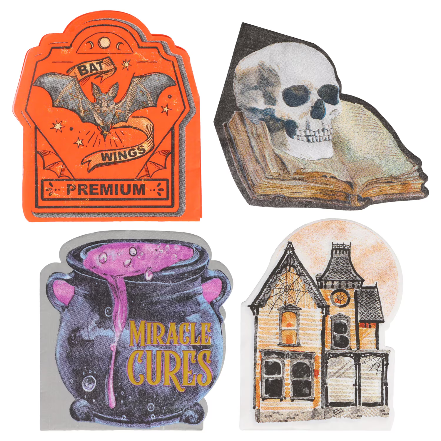 New themed napkins featuring bats, haunted houses, skeletons, and cauldrons. Great for parties or even crafting projects.