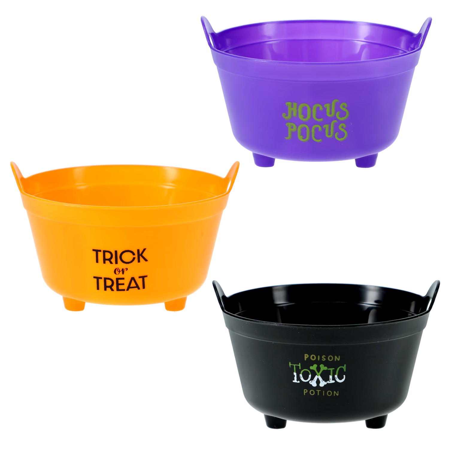 Small cauldrons perfect for candy or popcorn bar displays. Each pack includes four, making them a budget-friendly way to set up Halloween party treats.