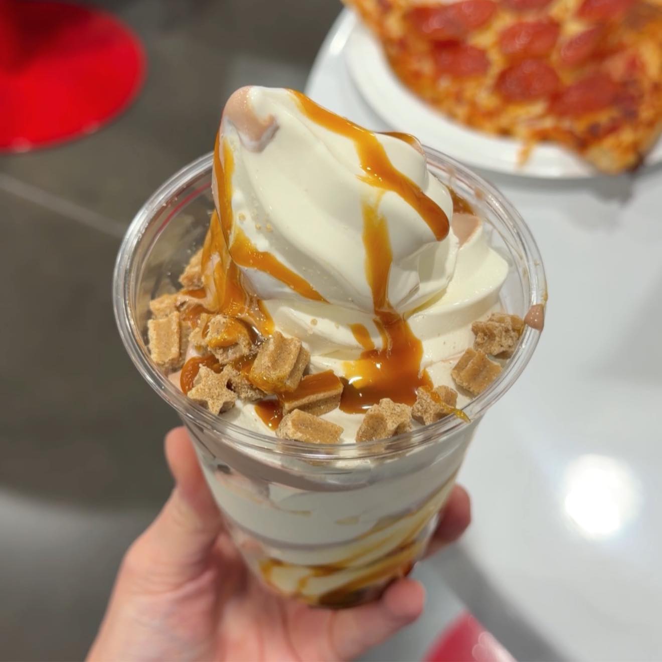 This new food court addition features vanilla soft serve ice cream topped with salted caramel sauce and crispy churro pieces.
