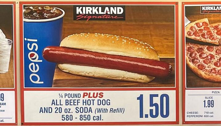 This iconic value meal includes a quarter-pound Kirkland Signature all-beef hot dog and a 20-ounce soda. The franks are USDA Choice beef with no fillers, binders, or artificial colors.