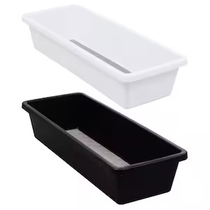 - Description: Plastic bins in various sizes (two inches deep) for sorting utensils, tools, spices, or dry goods in drawers, fridges, or cabinets; available in black or white with grip bottoms.