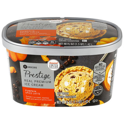 - Creamy pumpkin ice cream mixed with espresso flakes and a vanilla cream swirl.